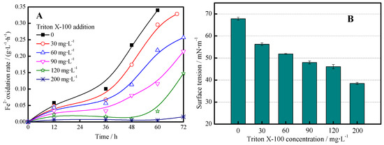 Influences of Triton X-100 on iron-oxidizing activity of At. ferrooxidans and on the surface tension of solution: (A) bacteria inoculation 10% (v/v), initial Fe2+ 8.9 g∙L−1, initial pH 2.0, rotational speed 160 rpm, and temperature 30 °C; (B) Fe2+ 0 g∙L−1, pH 2.0, and temperature 30 °C.