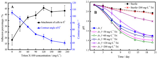 Influences of Triton X-100 on contact angle of S0 and bacterial attachment to S0, as well as on the oxidation of S0: (A) S0 1% (w/v), bacteria inoculation 5 × 107 cells·mL−1, temperature 30 °C, and adsorption time 30 min; (B) S0 1% (w/v), bacteria inoculation 10% (v/v), initial pH 2.1, and temperature 30 °C.