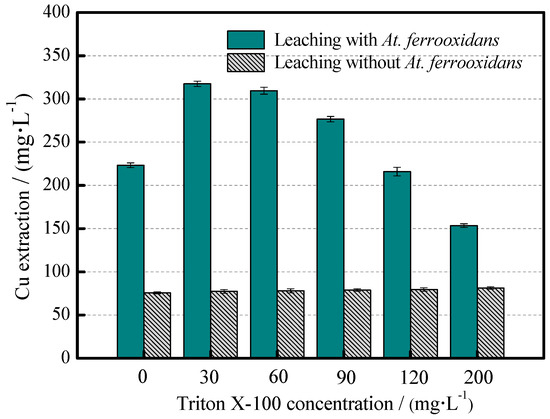 Influences of Triton X-100 on Cu extraction from chalcopyrite in the absence and presence of bacteria. Chalcopyrite 1% (w/v), bacteria inoculation 2 × 107 cells∙mL−1 for bioleaching systems, NaF 0.1 g·L−1 for abiotic leaching systems, initial Fe2+ 0 g·L−1, initial pH 2.0, and leaching for 24 days.