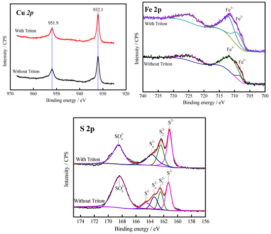 Figure 8 represents the XPS spectra of the surface of chalcopyrite bioleached with and without Triton X-100. In terms of Cu 2p, two spectra peaks of 932.1 and 951.95 eV existed whether Triton X-100 was added or not. This observation indicated that copper on the mineral surface might be in a +2 valence state, according to Todd et al. [44]. Thus, it was considered that the Triton X-100 addition could not change migration path of copper during the oxidation of chalcopyrite.