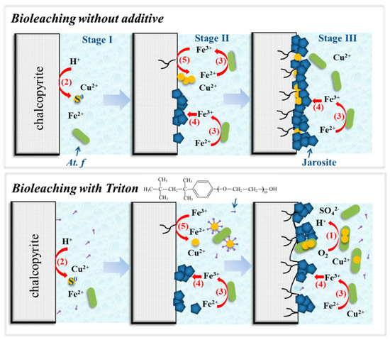 - In the first stage, the addition of Triton X-100 could hardly influence chalcopyrite leaching. Chalcopyrite was initially attacked by protons, simultaneously releasing ferrous iron and elemental sulfur, as Reaction (2) proceeded.