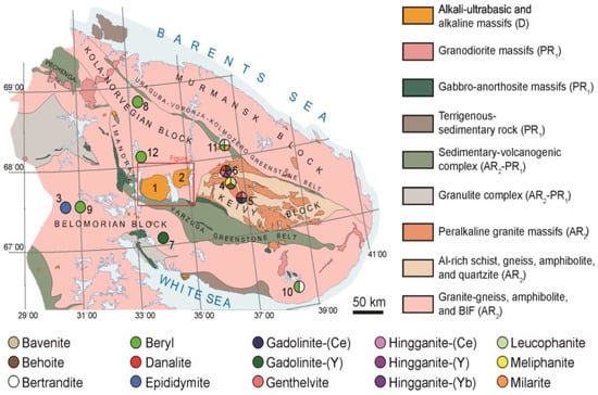 The first Be mineral discovered on the Kola Peninsula was apparently leucophanite from the Khibiny massif and mentioned by Chernik [] and Kostyleva [,]. In total 28 beryllium minerals are established on the Kola Peninsula up today (Table 1). According with the classification of Pekov [], among them only beryl is widespread, others are less common (as chrysoberyl and bertrandite) and most occur as trace minerals.