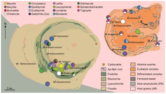Simplified geological map of the Khibiny-Lovozero alkaline complex (after []), with localities of Be minerals.
