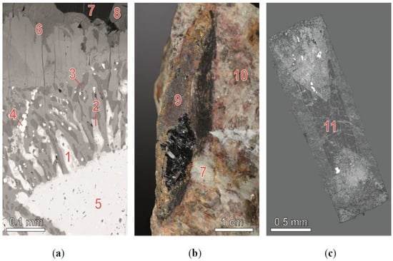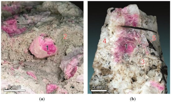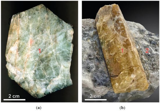 The Jona occurrence is represented by Proterozoic granite pegmatite bodies within metamorphic rocks—gneisses, migmatites and amphibolites (Figure 1). The lenticular pegmatite bodies extend up to 500 m in depth. These pegmatites are a source of mica and ceramic raw materials [].