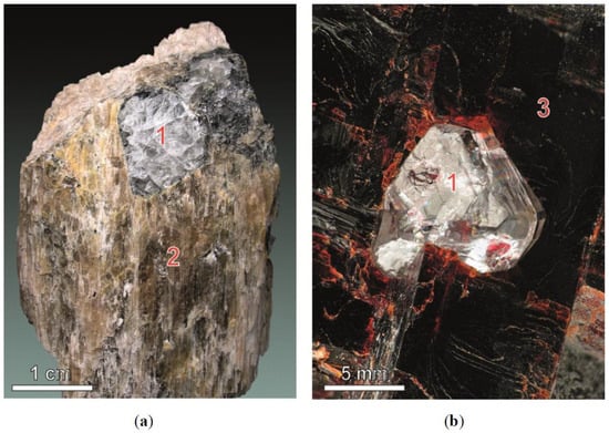Beryllium is a rare lithophile element; it is concentrated mainly in felsic and alkaline rocks. The beryllium content in rocks is low, and the average concentration of Be in the Earth’s upper crust is 2.1 ppm, while in primitive mantle it shows a 30-fold decreasing up to 0.07 ppm Be []. Beryllium tends to accumulate in late derivatives of alkaline and felsic rocks, i.e., pegmatites and hydrothermal veins. Due to specific crystal chemistry properties [,], there is a significant amount of Be minerals (121 minerals, according to IMA list from March 2018). Discoveries of beryllium minerals are accelerating and 18 new minerals were described since 2010 (IMA list of Minerals, March 2018). Minerals of extremely unusual composition have been defined among them, for example verbierite BeCr3+2TiO6 [].