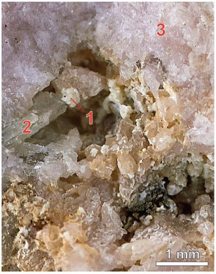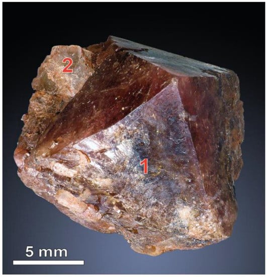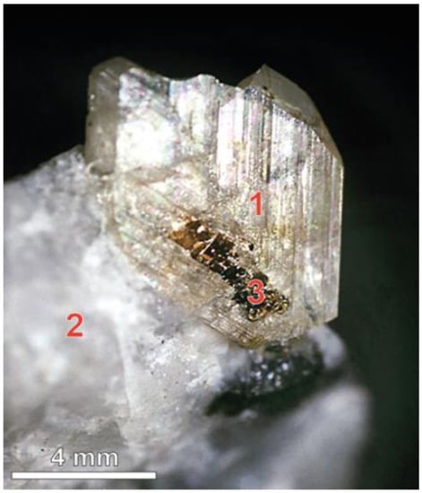 Beryl is found as an accessory mineral in undifferentiated plagioclase-microcline pegmatites occurring among the mica gneisses in pegmatites of Strel’na field []. Beryl is related to the plagioclase areas. Beryl is represented by well-faceted prismatic crystals up to 15 cm in length. Those crystals are often opaque, covered by a dense network of cracks intersecting in different directions.