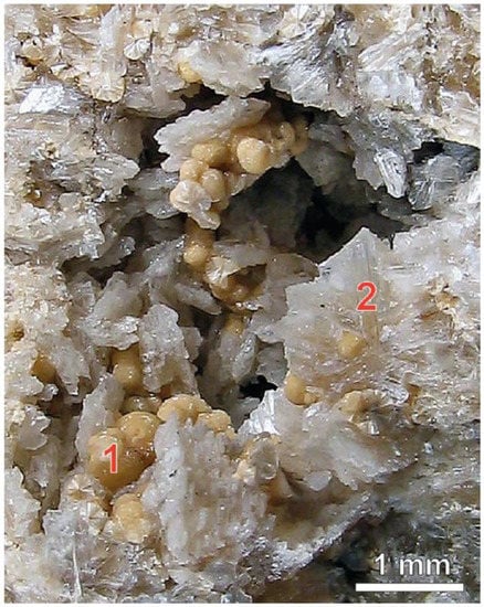 Bavenite Ca4Be2Al2Si9O26(OH)2 was found in spodumene pegmatites of the Kolmozero-Voronja belt (Figure 1) and confirmed by X-ray study []. The mineral is rare and occurs in two associations: (a) in association with late suggary (granular) albite as radially-fibrous aggregates of 0.1–1 cm (Figure 4) or as tiny veins of 0.01–0.1 mm thick, and (b) in cavities produced by leaching of spodumene, where it is a late mineral, covering quartz, microcline, albite, and stilbite and mantled on its turn by later chabazite-(Ca) and calcite.