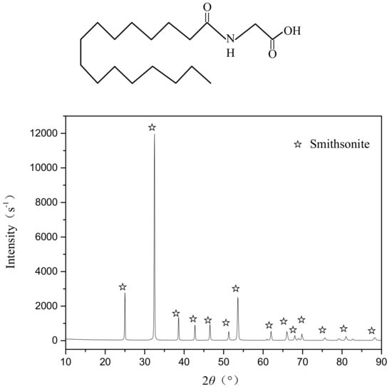The pure smithsonite samples used in all experiments were obtained from Yunnan Province in China. Subsequently, the samples were crushed and dry-ground using an agate mortar and pestle. For microflotation tests and TOC content studies, the ground product of smithsonite was sieved to achieve a particle fraction of −74 + 38 μm using a standard screen. The rest of the sample was ground to a particle fraction finer than 5 μm for zeta potential measurements, FTIR, and XPS analyses. The results of X-ray diffraction (XRD) patterns are shown in Figure 1, where it can be seen that only the diffraction peak of smithsonite was detected. It was confirmed that the smithsonite samples used in the experiments were of high purity.