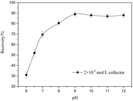 Smithsonite is zinc carbonate (ZnCO3), and carbonate minerals are well known to react readily under acidic conditions to consume large amounts of acid. Therefore, all experiments in this study were conducted only under neutral and alkaline pH conditions. Figure 2 displays the flotation recovery of smithsonite as a function of pulp pH (6–12) when treated with the collector at a concentration of 2 × 10−4 mol/L. The results clearly reveal that floatability increased as the pH increased from 6 to 9. No further increases in recovery were observed at higher pH values, at which the recovery remained relatively stable. In other words, the optimal flotation recovery of smithsonite was achieved at pH 9.