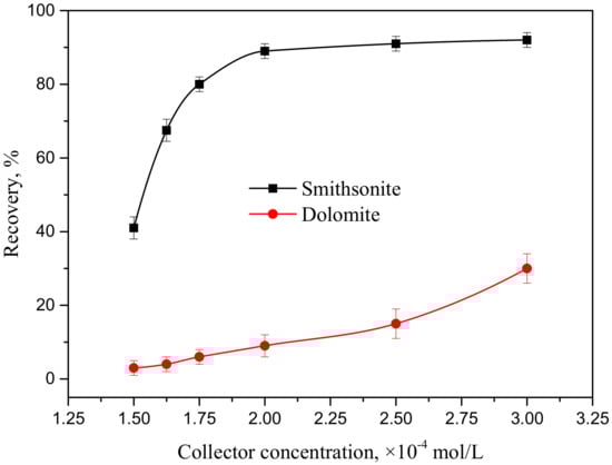To further know the influence of the HAA collector on smithsonite flotation, microflotation work was beneficial in seeing a standard gangue mineral (dolomite) to understand the selectivity of the reagent for smithsonite flotation. Recovery of smithsonite and dolomite as a function of collector concentrations was conducted at pH 9. Figure 3 shows excellent selectivity of HAA for smithsonite flotation in low collector concentration solution. The increasing collector dosage improved the recovery both of smithsonite and dolomite. Smithsonite recovery dramatically increased as the collector concentration was varied from 1.5 × 10−4 to 2 × 10−4 mol/L. Recovery was observed to increase only slightly at even higher concentrations. In particular, the flotation recovery of smithsonite exceeded 90%, which is a desired indicator, at collector concentrations in excess of 2 × 10−4 mol/L. Dolomite showed poor floatability in low HAA concentrations, and the floatability increased with the increasing collector concentrations. However, the recovery of dolomite did not reach 40% when the collector concentrations increased to 3 × 10−4 mol/L.