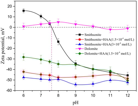 Figure 5 displays the zeta potentials of smithsonite in the absence and presence of the collector as functions of pH. The zeta potential of pure smithsonite became more negative with increasing pH, which was consistent with the findings of former investigations [,]. The isoelectric point (IEP) of smithsonite has been reported to lie between pH 7 and 8.8 [,]. As is evident from Figure 5, the IEP of pure smithsonite in the absence of the collector was approximately pH 7.6, which was in agreement with the results of previous studies. The zeta potential of smithsonite rapidly declined at pH values above 7.6.