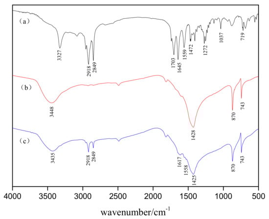 Fourier-transform infrared (FTIR) spectra of (a) the 2-(hexadecanoylamino)acetic acid (HAA) collector, and (b,c) smithsonite before and after treatment with HAA (concentration: 5 × 10−4 mol/L) at pH 9, respectively.