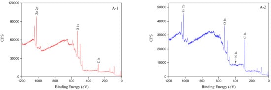 Panel A-1 in Figure 7 reveals that only elemental C, O, and Zn were detected in the full XPS spectrum of pure smithsonite treated with DI water, which shows that the smithsonite samples used in these experiments were of high purity. Compared to panel A-1, an N signal was observed in the XPS spectrum (panel A-2) after the smithsonite sample was treated with the collector, which was consistent with adsorption of the collector onto the smithsonite surface. Table 2 provides a semiquantitative summary of the atomic concentrations of the smithsonite surface before and after treatment with the collector. The carbon concentration was observed to increase from 42.38% to 69.59%, while the oxygen concentration decreased from 39.08% to 24.40%, and the zinc concentration decreased from 15.53% to 7.38%. At the same time, nitrogen, at a level of 2.97%, emerged on the mineral surface following treatment with the collector. These changes in atomic concentrations are further evidence that the collector was adsorbed onto the mineral surface.