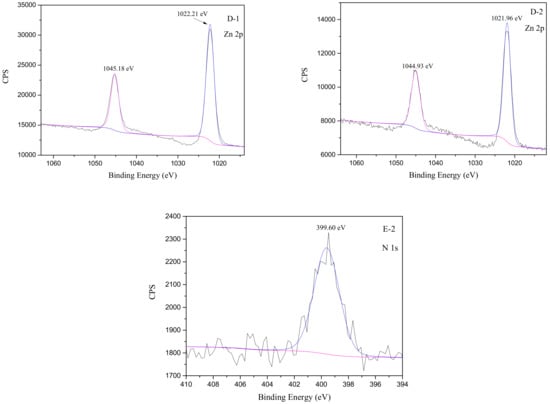 In panel B-1, the two C1s peaks, at 286.39 and 289.99 eV, corresponded to C–O and C=O bonds assigned to the carbon in the carbonate group of smithsonite samples [,], while the other peak at 284.84 eV was attributed to C–C and C–H contaminants []. A 0.18 eV shift in the C–O-bond peak and a 0.46 eV change in the energy of the C=O bonds in the carbonate groups shown in panel B-2 were attributed to collector adsorption. At the same time, the binding energy at 289.53 eV shown in panel B-2 was attributed to the C=O bond in the carboxylic group of the collector and carbonate groups []. In other words, only the C1s peaks at 289.99, 286.39, 289.53, and 286.57 eV were derived from the smithsonite sample: The remaining C1s binding energies were not assigned to the surface composition of pure smithsonite. In panel C-1, the O1s binding energy at 532.04 eV corresponded to the O in the C–O and C=O bonds of the carbonate group [,]. The O1s binding energy shifted from 532.04 to 531.92 eV following collector adsorption onto the smithsonite surface. In panel D-1, the two peaks at 1045.18 and 1022.21 eV in the spectrum of the untreated smithsonite sample corresponded to Zn2p1/2 and Zn2p2/3 binding energies and were consistent with previous reports [,,,,]. Following collector adsorption onto the smithsonite, the Zn2p1/2 binding energy was observed to shift to 1044.93 eV, while the Zn2p2/3 energy moved to 1021.96 eV: These 0.25 eV differences were attributable to Zn–O bond formation according to previous studies [], which was consistent with chemical adsorption of the collector at the Zn sites on the smithsonite surface. The carboxylic acid was deprotonated in alkaline solution. The formation of Zn–O bonds and the structure of the collector suggest that Zn–O bonds were formed through reactions of the Zn sites on the smithsonite surface and the carboxylates of deprotonated collector molecules. According to former studies, the first N1s peak at 399.60 eV (panel E-2) is attributed to the amino group of the HAA collector [,].