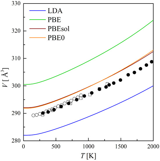 The first two steps of the algorithm, which we have just briefly described, have been performed by using four different functionals of the DFT, which belong to three different classes: the local-density approximation (LDA), two generalized-gradient approximation (GGA) functionals (PBE and PBEsol) and one hybrid functional (PBE0). The results in terms of the thermal expansion are presented in Figure 1, where the volume of forsterite is reported as a function of temperature up to 2000 K. Three independent sets of experimental data are reported from Bouhifd et al. [55] (filled circles), Ye et al. [56] (empty circles) and Hazen [57] (empty squares). The following considerations can be made: (i) as expected, different functionals provide different absolute values for the volume of forsterite, with the PBEsol and PBE0 functionals providing almost identical results in this case and the closest to the experimental values; (ii) all functionals provide a very satisfactory description of the thermal expansion of the system up to 2000 K. In particular, we want to stress that, despite predicting different absolute values for the equilibrium volume, different functionals provide an extremely consistent description of the thermal expansion of the system. This aspect has very interesting computational implications and is not specific of forsterite but is rather a common feature of all quasi-harmonic properties [22,23,24,45]. The computational implication is the following: while a more accurate (and costly) functional (like a hybrid one) is often needed to get a better description of the static absolute value of the equilibrium volume, one can safely work in terms of a less costly functional (like a GGA one) to get the thermal dependence of the volume.