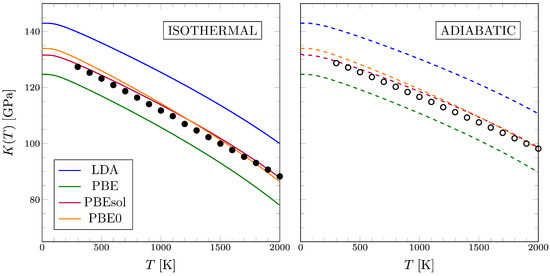 From the second step of our algorithm, we can also compute the thermal dependence of the bulk modulus of the system by evaluating the second derivatives with respect to volume of the Helmholtz free energy, as in Equation (14). The bulk modulus evaluated in this way is the isothermal one, while the adiabatic one can be obtained from the correction as in Equation (17). The isothermal and adiabatic bulk modulus of forsterite are reported as a function of temperature up to 2000 K in the left and right panels of Figure 2, respectively. Experimental data are from Anderson et al. [58] (filled and empty black circles for isothermal and adiabatic moduli). The same considerations made above on the volume hold here on the bulk modulus: (i) different functionals provide different absolute values, with PBEsol and PBE0 resulting in very similar descriptions, almost matching the experimental values; (ii) the computed quasi-harmonic thermal dependence of the bulk modulus is basically insensitive to the particular functional of the DFT used. Let us stress that the adiabatic correction to the isothermal bulk modulus in Equation (17) requires a good description of both quasi-harmonic (such as , , and ) and harmonic (such as ) thermodynamic properties. We have computed quasi-harmonic properties by working in terms of the primitive cell (28 atoms/cell), which already ensures convergence, while we have used a supercell containing 756 atoms to converge harmonic thermodynamic properties, which show a much slower convergence with sampling of phonon dispersion. The results reported in the right panel of Figure 2 show the good description of all quasi-harmonic and harmonic thermodynamic properties.