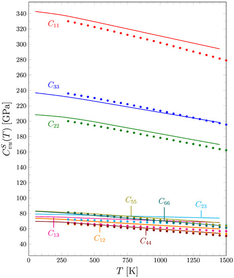 where is the isothermal bulk modulus defined in Equation (14), is the volumetric thermal expansion coefficient introduced in Equation (13), is the molar constant-volume specific heat of the system, and is the molar volume of the system. All the quantities entering Equation (17) can be computed with the HA and QHA. Adiabatic elastic stiffness constants are related to isothermal ones through the following relation [28]: