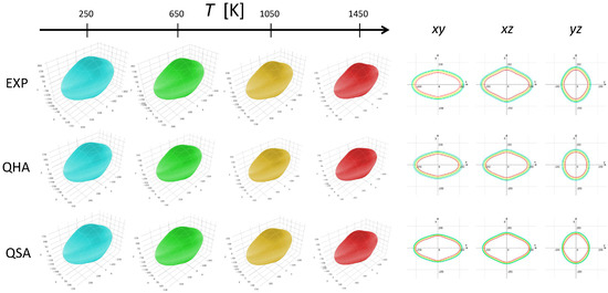 The characterization of the thermal dependence of single-crystal elastic constants is clearly crucial if one wants to discuss the evolution with temperature of the mechanical anisotropy of a material. This is relevant to minerals of geophysical interest as well as to other classes of materials such as metal-organic frameworks, whose mechanical instability at room temperature often represents a limiting factor to their effective use [59]. Once all elastic constants are known, the spatial dependence of the Young modulus of a material can be computed [60]. In Figure 4, we report the spatial dependence of the Young modulus of forsterite as a function of temperature. The experimental evolution of the mechanical anisotropy is reported as well as the computed one. Forsterite has a very anisotropic mechanical response. In particular, the system has a larger rigidity along the x-axis than along y and z, which results in strong mechanical anisotropies in the and planes, while the mechanical anisotropy is way less pronounced in the plane. From the analysis of the experimental data in Figure 4, we see that, as temperature increases, the mechanical response of the system changes in two respects: (i) the Young modulus shrinks, which corresponds to an overall softening of the system with temperature; and (ii) the mechanical anisotropy becomes more pronounced (clearly seen in the 2D projections of the Young modulus in the right panels). Both these effects are nicely reproduced by the full quasi-harmonic description of the thermo-elasticity, apart from a slight underestimation of the mechanical anisotropy in the plane.