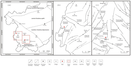 Figure 1. (a) Location of the study area in southwest Guizhou Province, China; (b) main structures in Panxian County; (c) main structures in Xingren County.
