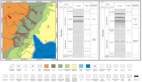 Figure 2. (a) Sedimentary facies in southwest Guizhou Province, modified from Dou et al. [29]; (b) stratigraphy in Panxian County; (c) stratigraphy in Xingren County.