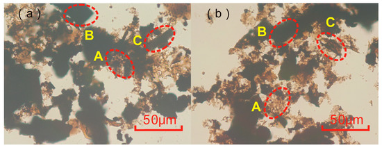 Figure 3. Macerals of transitional Longtan Shale samples from YV-1 (a) and XD-1 (b). A is brown dispersed sapropelic component; B is black inertinite; C is brown strip vitrinite.