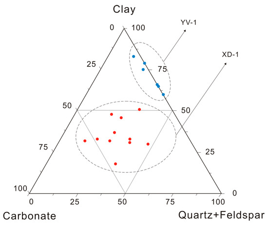 Figure 4. Mineralogical ternary diagram of transitional Longtan Shale samples from YV-1 and XD-1.