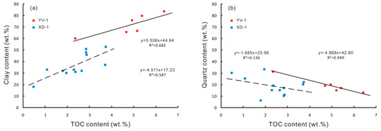 Figure 6. Relationships between TOC content and clay content (a), quartz content (b) of transitional Longtan Shale samples from YV-1 and XD-1.