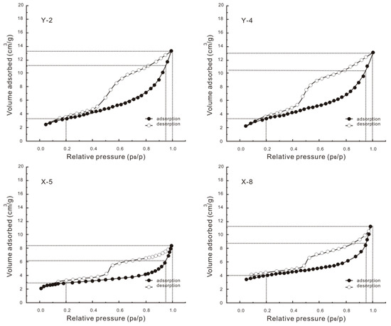 Figure 7. Typical N2 adsorption-desorption isotherms of transitional Longtan Shale samples from YV-1 and XD-1.