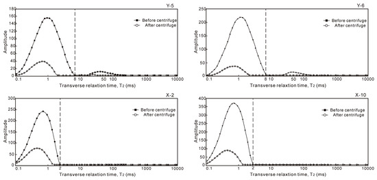 The nuclear magnetic resonance (NMR) T2 spectrum in this study can be divided into unimodal spectrum and bimodal spectrum (Figure 8). The unimodal spectra are frequently found in samples of XD-1 with a relatively short relaxation time (T2 = 2 ms), indicating that small pores occupy a large proportion of the signal and are well developed. The bimodal spectra are frequently found in samples of YV-1, suggesting that besides small pores, large pores are also developed. Take sample Y-6 as an example, we observed two peaks before centrifuge processing, and the first peak was much higher than the second one. The discontinuity of bimodal spectrum indicates that samples have poor connectivity between small pores and large pores, and the pores in samples are relatively closed. After centrifuge processing, the first peak attenuated and the second peak vanished. The reduction and disappearance were due to the connectivity between pores, which was a result of the different permeability [27].