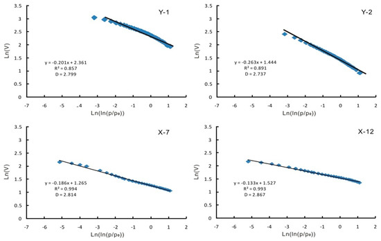 The fractal dimension (D) can reflect the pore surface roughness and the pore structure complexity. According to N2 adsorption-desorption data and fractal FHH model, the fractal dimension of shale samples can be calculated by the slope of ln(V) vs. ln(ln(p/p0)). As shown in Figure 9, the ln(V) vs. ln(ln(p/p0)) is linearly correlated, with good fitting correlation coefficients. The results in Table 5 show that different samples have different fractal characteristics. The fractal dimension of YV-1 is in the range of 2.652–2.862, with an average value of 2.756, while the fractal dimension of XD-1 is in the range of 2.702–2.867, with an average value of 2.787. The fractal dimension of XD-1 is slightly higher than that of YV-1, indicating a more rough pore surface and a more complicated pore structure.