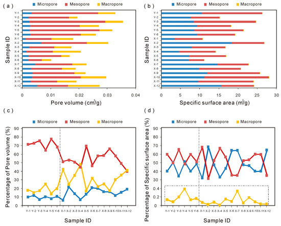 The average micro-, meso-, and macro-SSA values of YV-1 are 8.9595 m2/g, 11.8084 m2/g and 0.0383 m2/g, accounting for 41.41%, 56.75% and 1.84% of the total specific surface area, respectively, while the average micro-, meso-, and macro-SSA values of XD-1 are 10.1204 m2/g, 9.9588 m2/g and 0.0209 m2/g, accounting for 50.35%, 48.61% and 1.04% of the total specific surface area, respectively (Table 6 and Figure 10d). Similar to the pore volume distribution, samples of XD-1 have larger micropore specific surface area, while samples of YV-1 have larger mesopore specific surface area because of the extremely high clay content. Micropore and mesopore are the main contributors to SSA, while the contribution of macropore is negligible (Figure 10d).