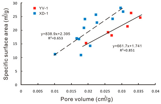 Figure 11. Relationships between pore volume and specific surface area of YV-1 and XD-1.