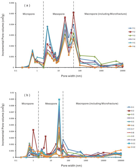 Figure 12. Pore size distribution curves of incremental pore volume of transitional Longtan Shale samples from YV-1 (a) and XD-1 (b). The boundaries between micropore, mesopore and macropore were highlighted by bold dashed lines.