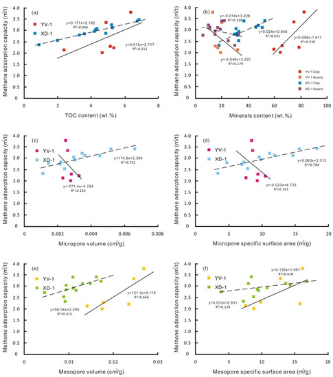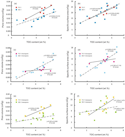 The relationships between TOC content and pore structure parameters are shown in Figure 14. The positive relationships are observed between TOC content and PV (R2 = 0.826 and 0.544 in Figure 14a), SSA (R2 = 0.667 and 0.589 in Figure 14b), as proposed by many studies [14,56]. Both YV-1 and XD-1 have high TOC content, thus the difference may be related to their maturity. Not all OM can produce OM pores. Samples of YV-1 are in the low maturation stage, and OM pores have not yet been massively produced, which leads to a relatively low correlation. There is a significant positive relationship between TOC content and micropore volume, specific surface area (R2 = 0.669 in Figure 14c and R2 = 0.684 in Figure 14d) of XD-1 samples. However, we note that there is a significant positive relationship between TOC content and mesopore volume, specific surface area of YV-1 samples (R2 = 0.668 in Figure 14e and R2 = 0.624 in Figure 14f), rather than micropore volume and specific surface area. This difference is mainly caused by OM pores in organic matters. Bubble-shaped OM pores were frequently observed in XD-1 samples because of the formation of gaseous hydrocarbon (Figure 13c). While, irregular-shaped OM pores with the pore size in the range of 10–30 nm, which greatly contribute to mesopore volumes, were sporadically distributed in YV-1 samples based on the analysis of SEM images (Figure 13a).