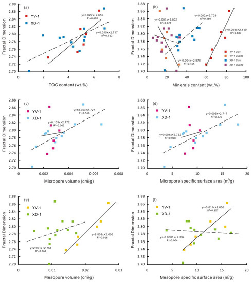 The nitrogen adsorption fractal dimension (D) is positively correlated with TOC content (R2 = 0.670 and 0.512 in Figure 16a) and clay mineral content (R2 = 0.887 and 0.360 in Figure 16b). It suggests that TOC and clays have a significant influence on the surface roughness and the structure complexity of pore system. The irregular surface of kerogen and clay minerals enhances the heterogeneity of shale reservoir and provides more adsorption space. In addition, pore types and geometric shapes also influence fractal dimension. For example, H2 type samples with ink bottle-shaped pores in this study have higher fractal dimensions than H3 type samples with slit-shaped pores (Table 5 and Figure 7). As observed in SEM images, OM-hosted pores may interconnect with each other and form a complicated system during hydrocarbon generation (Figure 13b), and mineral-hosted pores may be deformed or compounded due to compaction (Figure 13g). Their properties and shapes may transform from regularity to complex and thus result in the increase of fractal dimension. The extreme value of XD-1 in Figure 16b may originate from changes in composition or structure of clay, which leads to a relatively low correlation. As previous studies proposed [59,60], there is a negative correlation between fractal dimension and quartz content in YV-1 samples (R2 = 0.465 in Figure 16b) and no correlation in XD-1.