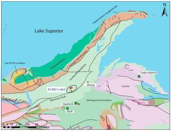 - Bitterroot Resources Ltd. Echo Lake Ni/Cu/PGE Project: Upper Peninsula of Michigan; 1999 Technical Report on Summary of Project Area; Bitterroot Resources Ltd.: West Vancouver, BC, Canada, 1999; pp. 1–26. [Google Scholar]