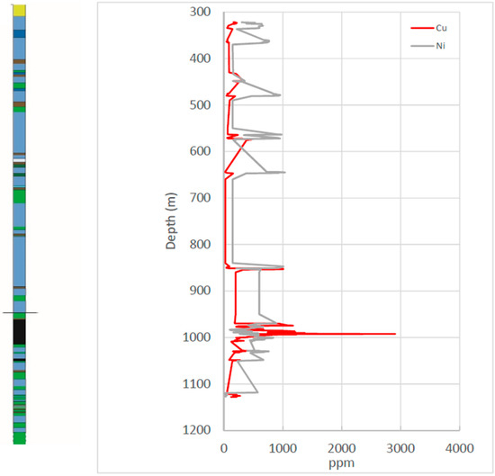 In the complete layered interval, the concentration peaks for Pt and Pd overlap with each other, but the peak for Cu does not (Figure 5, Figure 6 and Figure 7).This stratigraphic offset of concentration peaks has been reported from other layered-type sulfide deposits, such as the Sonju Lake intrusion [12], Skaergaard Complex [39], and the Bushveld Complex [59], and has been explained by differences in liquid/silicate partitioning coefficients for chalcophile metals, or by the fractionation of sulfide melt during compaction of layered successions of cumulates [40]. The low abundance of Ni in this mineralized sulfide interval can be explained by the depletion of Ni in the magma, caused by the large fractionation of olivine early in the crystallization history.