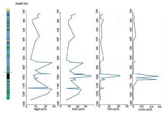 A stratigraphic sequence of the observed layered units in the Echo Lake intrusion, as revealed from drill core studies, is shown in Figure 5, Figure 6 and Figure 7. Notable PGE-enrichment is observed within a 45 m thick layer of Fe-Ti oxide rich olivine gabbro. Titaniferous magnetite and ilmenite are the principal oxide minerals. These minerals mostly constitute 10–25 vol. % of the oxide-rich olivine gabbro unit. However, in some parts, the oxide minerals form massive zones with fine interstitial grains of silicate minerals (Figure 4). At the Fe-Ti oxide-rich zone, there is an interval with disseminated grains of sulfide minerals. Peak concentrations of Pt and Pd of 550 ppb and 634 ppb, respectively, are measured in this interval at a depth of about 998 m [18]. Pt and Pd contents show positive correlation in all studied depths of the intrusion, although Pd shows a higher concentration in most intervals (Figure 5 and Figure 6). Stratigraphic variations of MgO, TiO2, Cr2O3, and FeO (total) in the layered sequences are shown in Figure 8.