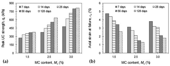 Variations of (a) peak UC strength qu and (b) axial strain at failure εu against MC content for the samples tested at various curing times (i.e., MxFyTz where x = {1.5, 2.5, 3.0}, y = {0} and z = {7, 14, 28, 56, 128}).