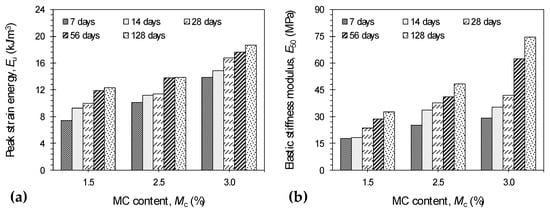 Variations of (a) peak strain energy Eu and (b) elastic stiffness modulus E50 against MC content for the samples tested at various curing times (i.e., MxFyTz where x = {1.5, 2.5, 3.0}, y = {0} and z = {7, 14, 28, 56, 128}).