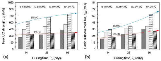 As demonstrated in Figure 4, the performance of 4% PC was found to be on par with that of 1.5% MC, while the higher MC inclusions of 2.5% and 3% unanimously outperformed 4% PC in terms of both strength and stiffness. Such observations can be attributed to the more dominant self–hardening features exhibited by MC compared with that of PC. Calcium hydroxide or Ca(OH)2 is a by-product of PC hydration during the pozzolanic reactions stage; however, it does not contribute to further strength development, owing to the lack of any remaining silicate and aluminate units in the medium which are normally exhausted during PC hydration. When slag-blended cement or MC is used as the main cementitious binder, the additional silicate and aluminate units in slag particles gradually react with Ca(OH)2 and water, thereby resulting in the formation of additional cementation products as part of secondary pozzolanic reactions which further densify the matrix and hence enhance the peak UC strength.