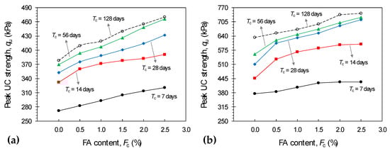 Variations of peak UC strength qu against FA content for the samples tested at various curing times: (a) M1.5FyTz; (b) M2.5FyTz (y = {0, 0.5, 1.0, 1.5, 2.0, 2.5} and z = {7, 14, 28, 56, 128}).
