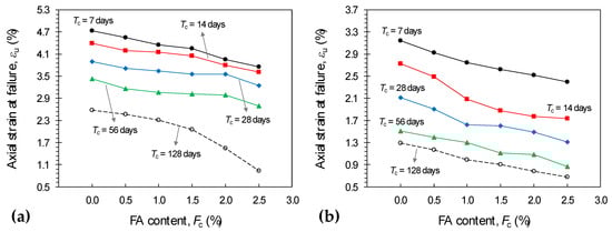 Variations of axial strain at failure εu against FA content for the samples tested at various curing times: (a) M1.5FyTz; (b) M2.5FyTz (y = {0, 0.5, 1.0, 1.5, 2.0, 2.5} and z = {7, 14, 28, 56, 128}).
