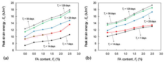 Variations of peak strain energy Eu against FA content for the samples tested at various curing times: (a) M1.5FyTz; (b) M2.5FyTz (y = {0, 0.5, 1.0, 1.5, 2.0, 2.5} and z = {7, 14, 28, 56, 128}).