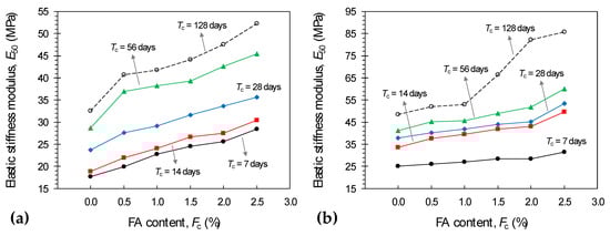 Variations of elastic stiffness modulus E50 against FA content for the samples tested at various curing times: (a) M1.5FyTz; (b) M2.5FyTz (y = {0, 0.5, 1.0, 1.5, 2.0, 2.5} and z = {7, 14, 28, 56, 128}).