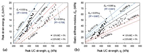 Figure 9a,b illustrate the variations of Eu and E50 against qu for various MC + FA-treated mixtures, respectively. The variations of Eu lies within the 0.027qu < Eu < 0.039qu and 0.021qu < Eu < 0.030qu domains (Eu in kJ/m3, and qu in kPa) for the samples treated with Mc = 1.5% and 2.5%, respectively. For E50, however, wider domains in the forms of 0.056qu < E50 < 0.111qu and 0.064qu < E50 < 0.095qu (E50 in MPa, and qu in kPa) can be observed, respectively. For any given MC content, the variations of Eu and E50 both exhibited good correlations with qu. In this case, simple correlative models in the forms of Eu = 0.033qu (with R2 = 0.814) and E50 = 0.085qu (with R2 = 0.641) can be obtained for Mc = 1.5%. For the samples treated with Mc = 2.5%, the correlations changed to Eu = 0.024qu (with R2 = 0.708) and E50 = 0.078qu (with R2 = 0.667), which strongly indicate a lower rate of increase in both Eu and E50 with respect to an increase in qu.