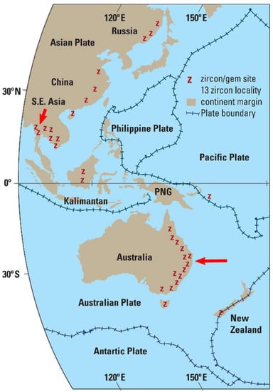 Regional setting and location of Myanmar and East Australian gem deposits, within the West Pacific continental margin zircon-corundum gem deposit zones (z), along the Asian and Australian plates [23,24]. Mogok and Mong Hsu, Myanmar, deposits (short arrow) are the western most sites [26] and New South Wales deposits (long arrow are among the eastern most group [9].