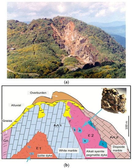 Thurein Taung ruby locality: (a) Hill exposing gem workings and scene for underlying geology section. Viewed from the east. Basal distance across view is ~600 m; (b) Sketch diagram across geological units (symbols and labels). V/H = 1, M1 = White Marble, M2 = Diopside marble, Gn = Gneiss, ε1 = ijolite dyke, ε2 = alkali syenite pegmatite dyke. Sapphire-bearing lithologies intrude the marbles (blue arrows), with sapphire deposits (s, inset). Ruby is associated with skarn near the top of the hill. Images; Kyaw Thu.