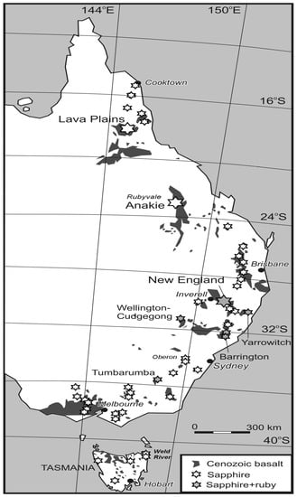 - Sutherland, F.L.; Fanning, C.M. Gem-bearing basaltic volcanism, Barrington, New South Wales: Cenozoic evolution based on basalt K–Ar ages and zircon fission track and U–Pb isotope dating. Aust. J. Earth Sci. 2001, 48, 221–237. [Google Scholar] [CrossRef]