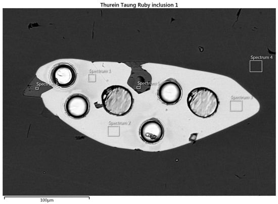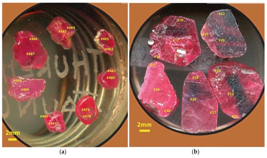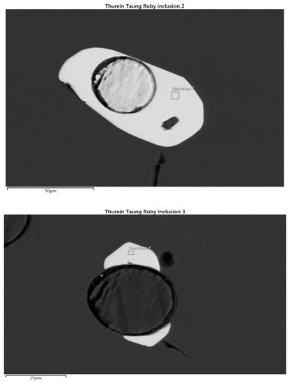 The Myanmar ruby samples and mineral inclusions used for U-Pb age dating were analyzed for trace elements contents by LA-ICP-MS techniques, supplemented by further EDS analysis (see below) at the University of Tasmania. Previously determined trace elements in New South Wales, East Australian ruby samples, were used for the comparisons had been analyzed by similar LA-ICP-MS methods at University of Tasmania (Barrington Tops, Macquarie River) and GEMOC Key Centre facilities, Macquarie University, Sydney (New England gem field). They are detailed in other publications [9,48].